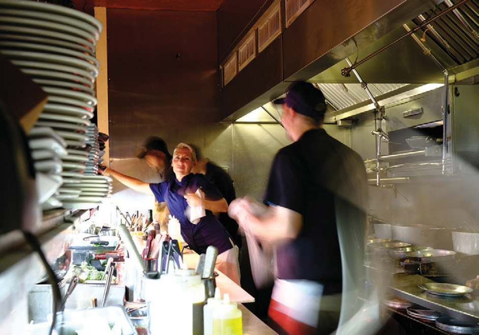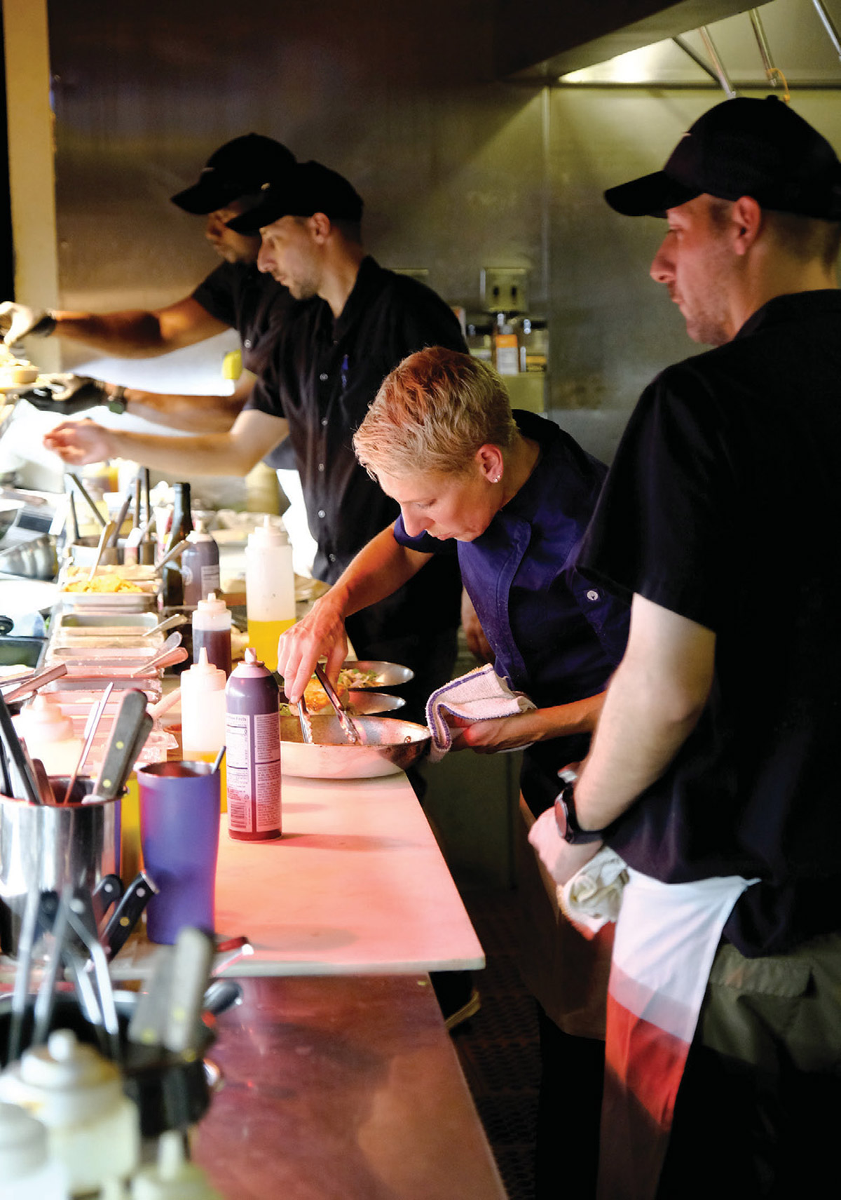 Superwoman Maria Pollio and her team work efficiently to handle tonight’s fall crowd. In season, this six-person crew may send out three hundred covers during a four-and-a-half-hour dinner shift. The kitchen line is a well-coordinated team that knows to maneuver within their designated boundaries. Pollio, petite and sporting a blonde cropped haircut reminiscent of a young Annie Lennox, is unflappable with a full twelve burner cooktop flaming before her. On any given night, the sauté station cranks out approximately one third of the evening’s entrees for which Pollio is solely responsible. Almost another third of the plates are handled by brother Andrew, resident grill master. Pollio describes Andrew as the even-keeled creative sibling with an artistic flair for plating. Twin brother Adam’s culinary versatility allows him to rotate wherever needed and he covers Pollio’s position in her absence. She credits Adam as being the best at training new staffers at any of the back of the house stations. Pollio says, “He is patient but has exceptionally high standards and makes a great manager. I tend to be more of a people-pleaser. I have complete faith in both of my brothers that they can step in and run the show effectively when I am not here. They have surpassed any expectations I have ever had for them and at this point we equally share the kitchen responsibilities. Honestly, sometimes I feel like I work for them!”