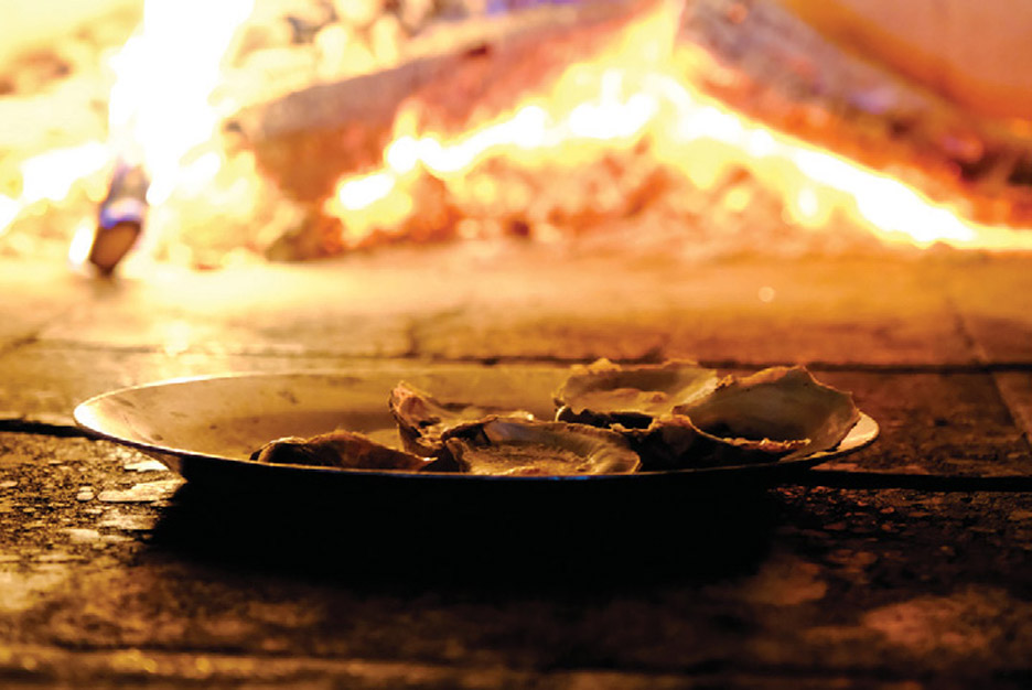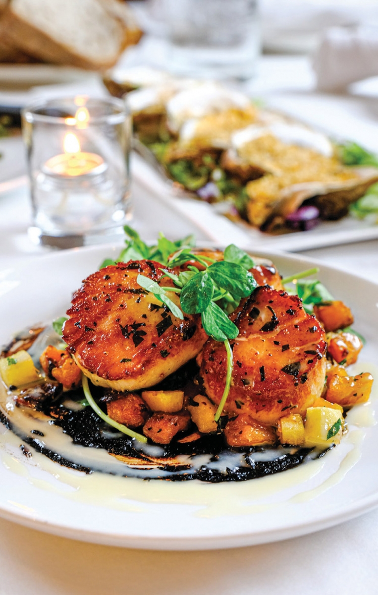 A fall visit reveals a hum of bustling activity, and a lively musical playlist lends to the upbeat vibe. A fourteen-stooled bar is backed by high shelves displaying an exceptional selection of liquors and cordials. The main dining space can accommodate sixty-five, and a three-season heated enclosed patio, strung with fairy lights, doubles the capacity for much of the year. Striking glass custom lamp shades and bar sconces courtesy of Michael Magyar (The Glass Studio, East Sandwich) lend a warm glow to the dining room. Odin K. Smith, a Brewster grade-school classmate of Zartarian’s, is the artist behind the Cape-inspired land and seascapes adorning the walls. The narrow open kitchen runs the length of the room beyond the bar area. Whimsical metal squids sculpted by Steve Swain (Frying Pan Gallery, Wellfleet), suspend from above the open pass.