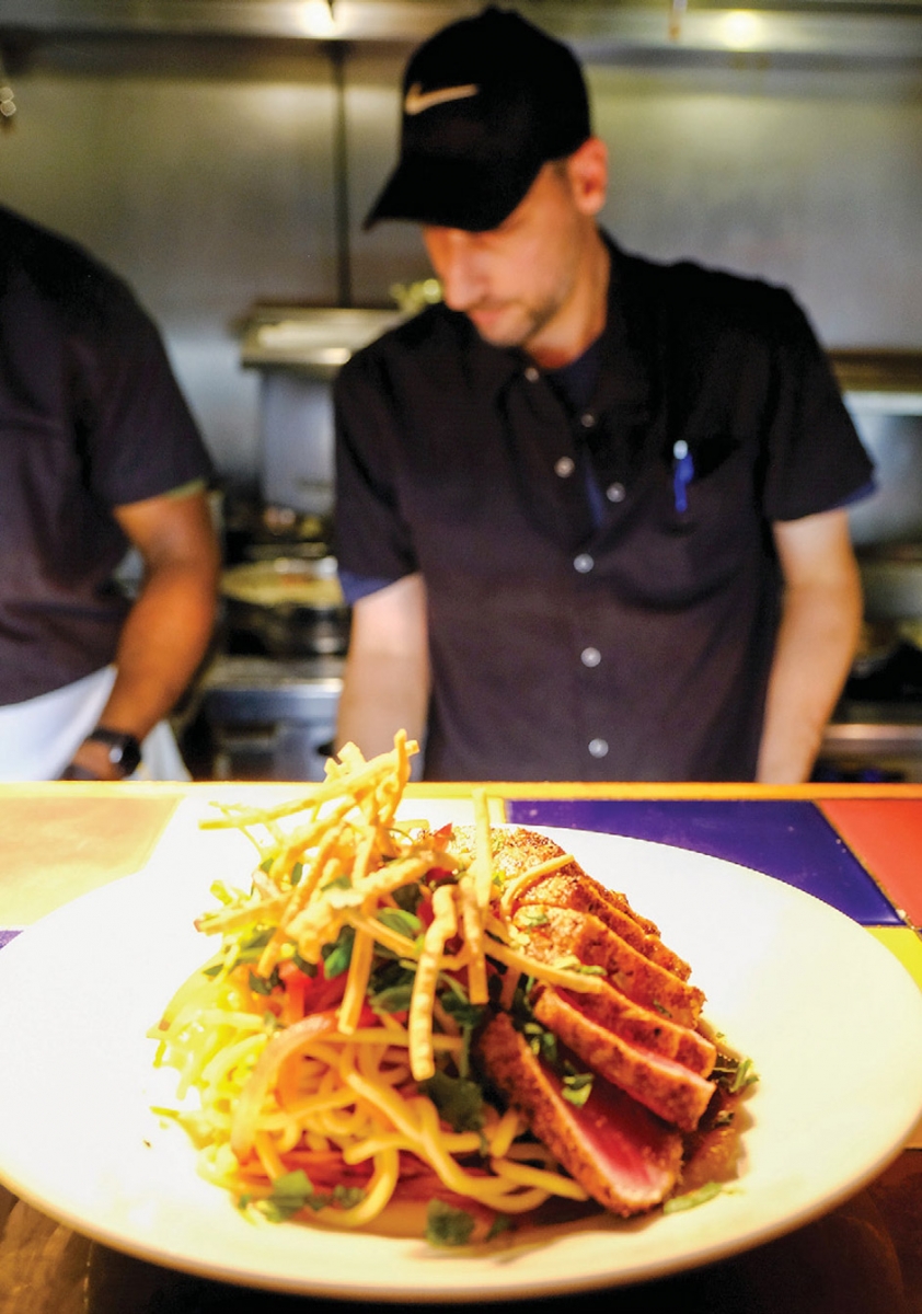 Large plates provide innovative choices from land and sea and everything in between. The pan-roasted halibut, a personal favorite of Pollio’s and ours, comes crowned with a miso butter-poached lobster claw atop fragrant basmati rice complemented by a fennel, bok choy, apple and mango salad… a pure mouthful of joy. An equally eye-catching and sumptuous dish is the sushi-grade seared blackened tuna partnered with a vegetable lo mein noodle salad tossed in a citrus plum vinaigrette.