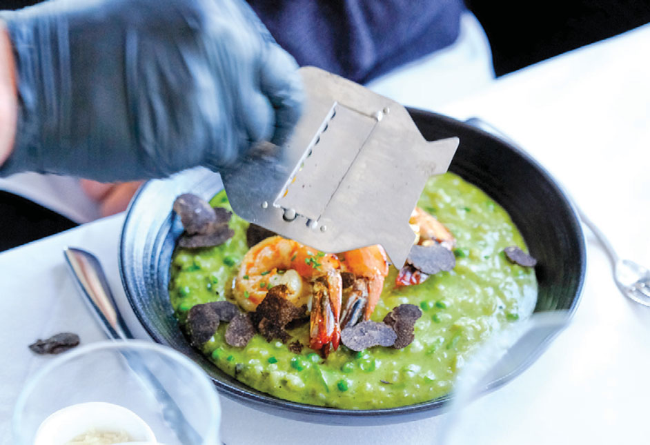 Black Perigord truffles, imported from France, are available as an upgrade to any entrée in season. Freshly shaved table-side by Chef, this delicacy elevates my decadent Risotto Verde (asparagus, English peas, trumpets, mascarpone, Parmigiano-Reggiano) into the stratosphere with an indescribable essence – truly a luxurious treat.